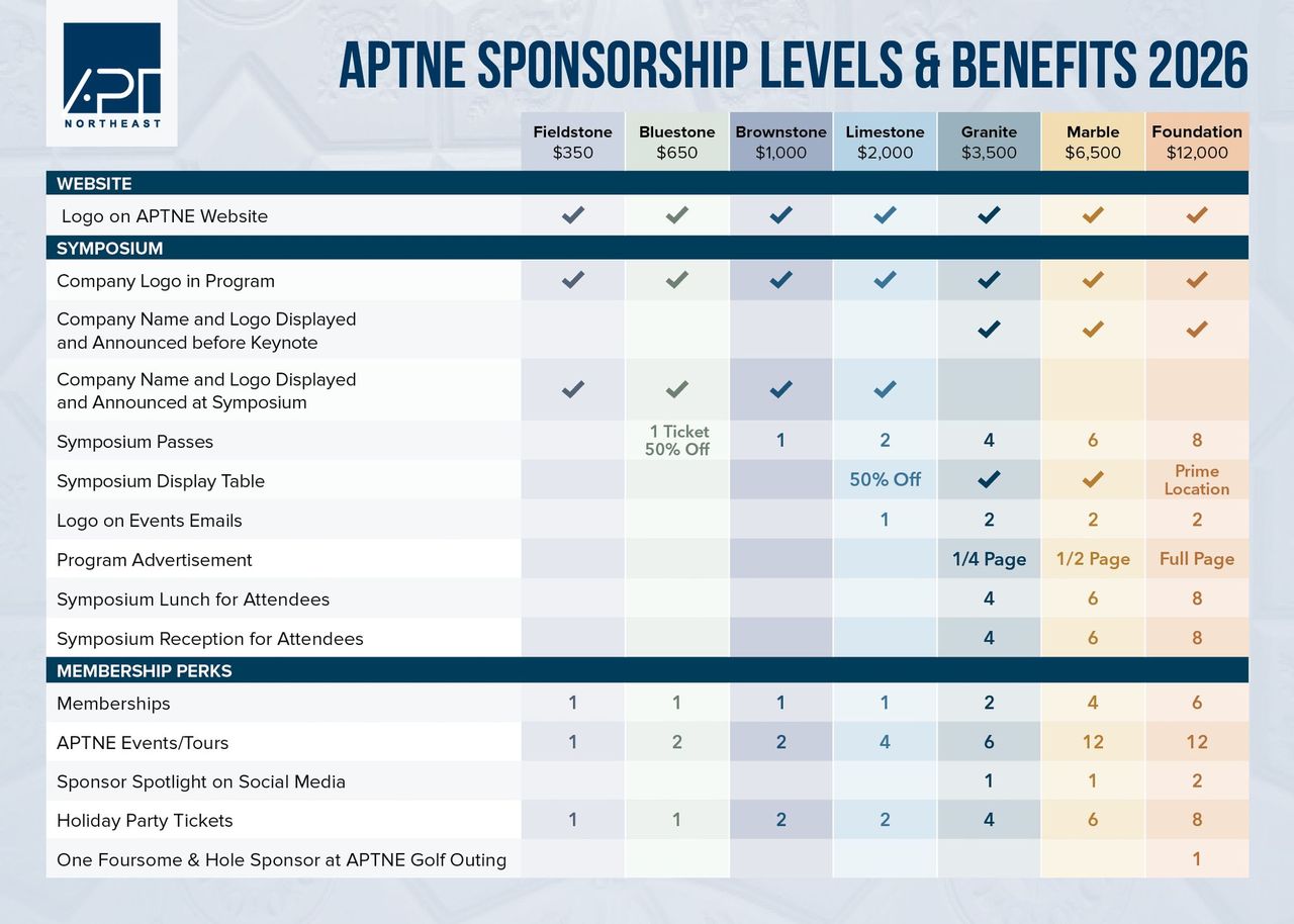 We Invite you to Become a Sponsor!There are a variety of different levels and benefits that come with being a sponsor for APTNE. Please see the information below and considering becoming a sponsor today! Become a SponsorSponsorship Term:Sponsorship/Membership will cover one year (Jan 1 – Dec 31). |